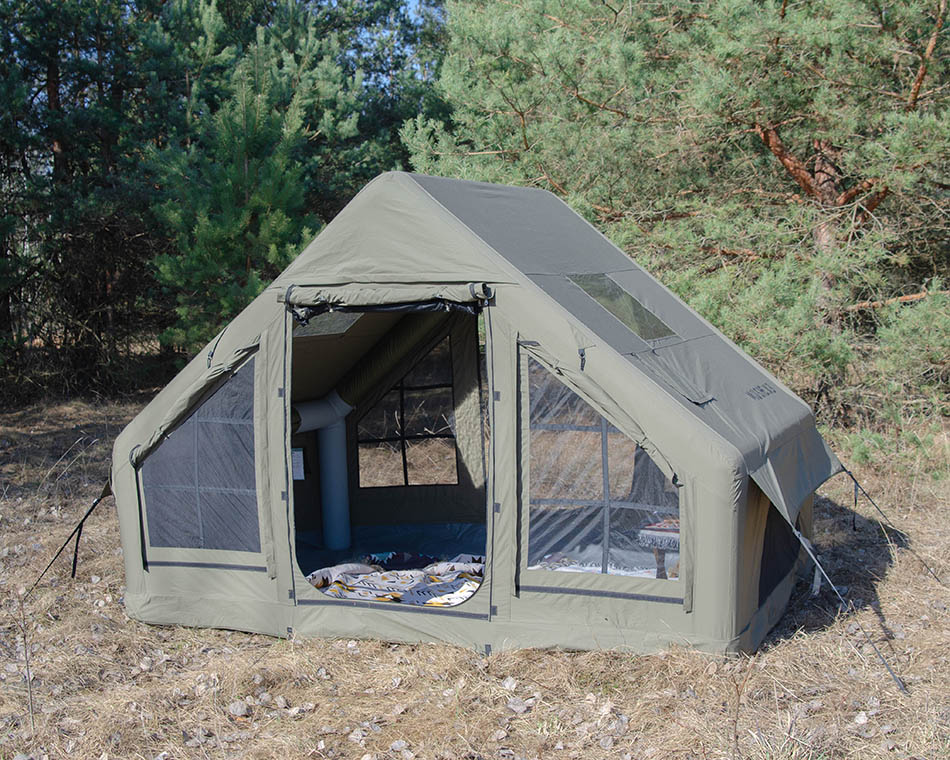 – Išlankstyti ant lygaus pagrindo – Pripūsti (truks tik pora minučių, pompa į komplektą įeina) – Įstumiami kuoliukai į žemę ir palapinė pritvirtinama prie žemės.